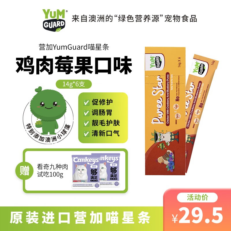 营加(YumGuard)原装进口猫零食猫条 宠物湿粮 猫咪果泥 添加澳洲小球藻 鸡肉蔓越莓蓝莓14g*6支