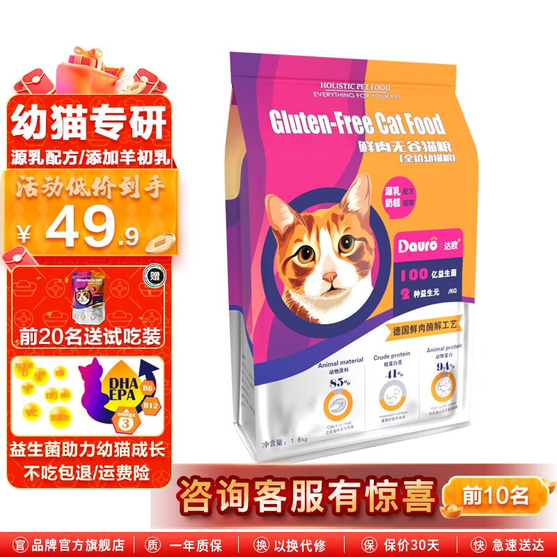 达欧(Dauro)幼猫猫粮奶糕 1-12月全价天然无谷粮猫咪食品 幼猫专用1.8Kg【源乳易吸收】
