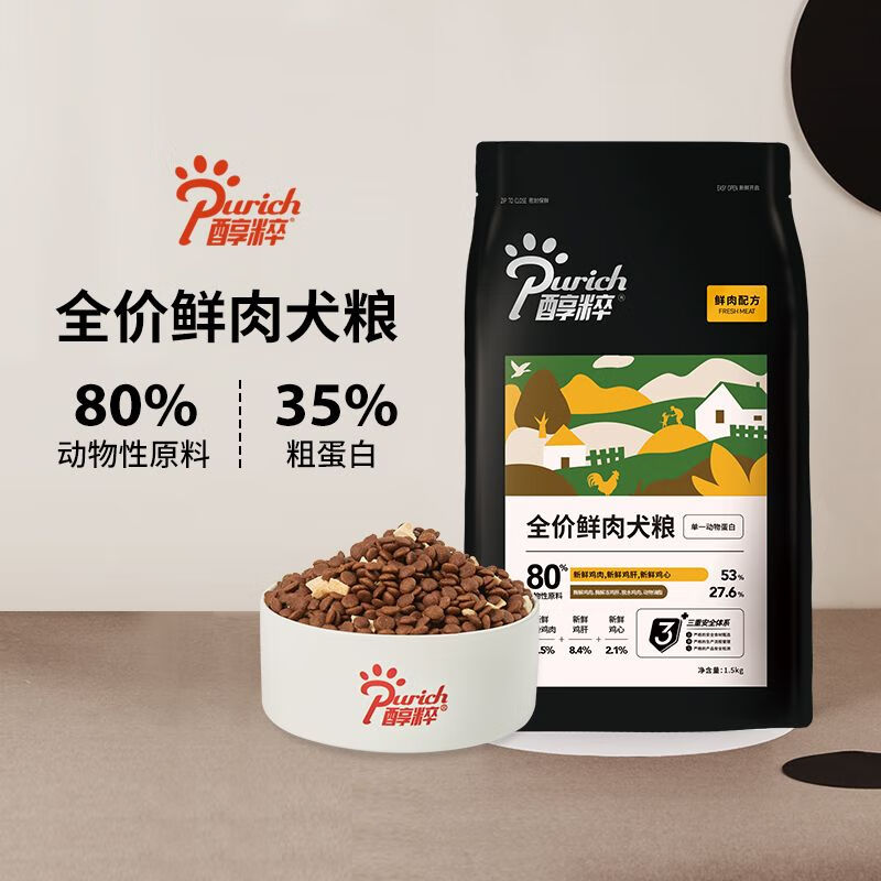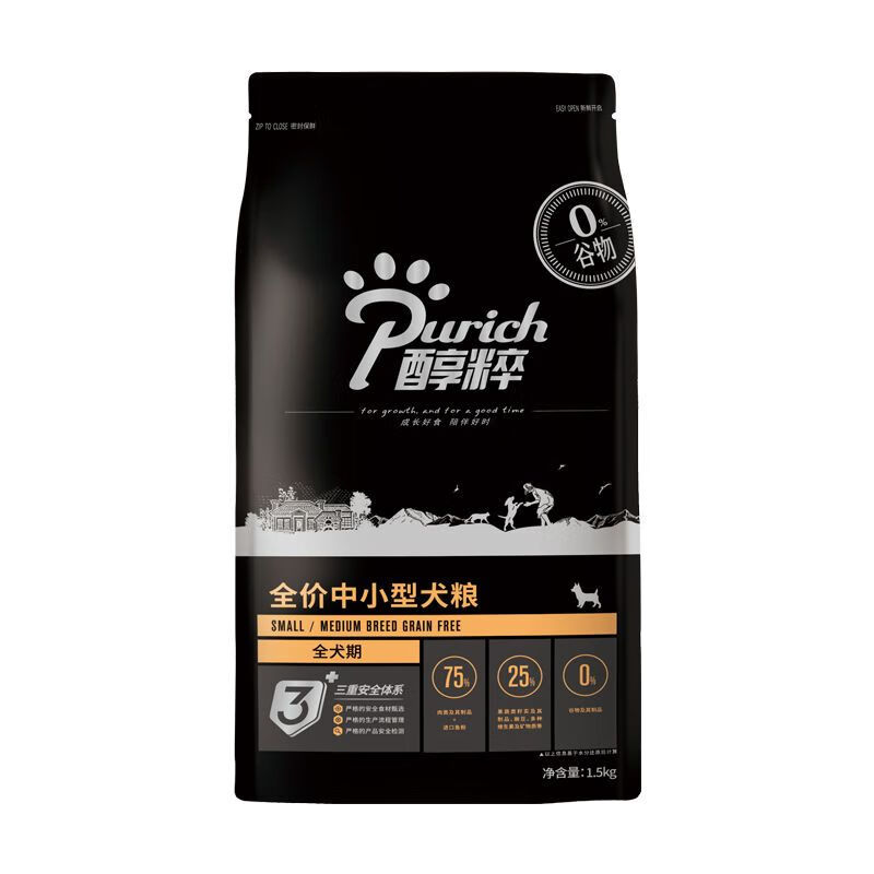 醇粹(Purich)狗粮黑标1.5kg狗粮保货中小型犬通用型大袋冻干纯粹犬粮 中小型犬无谷冻干犬粮1.5kg