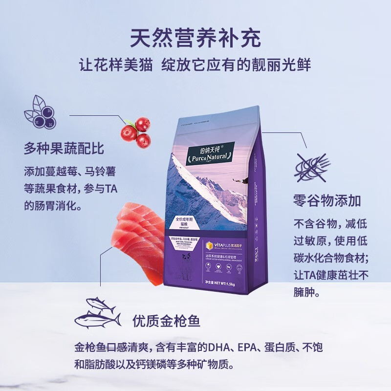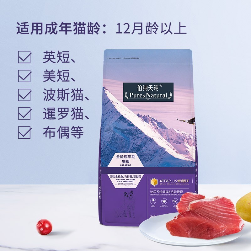 【现货直发】伯纳天纯成猫猫粮1.5kg猫粮10kg无谷天然粮泌尿系统毛球管理蔓越莓金枪鱼 成猫猫粮1.5kg