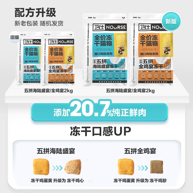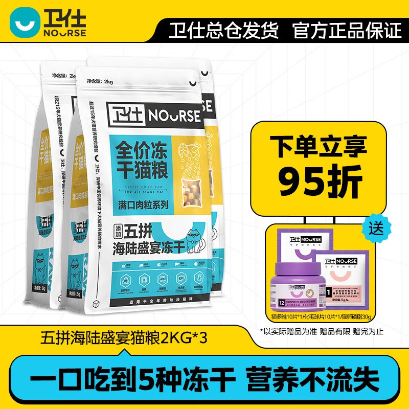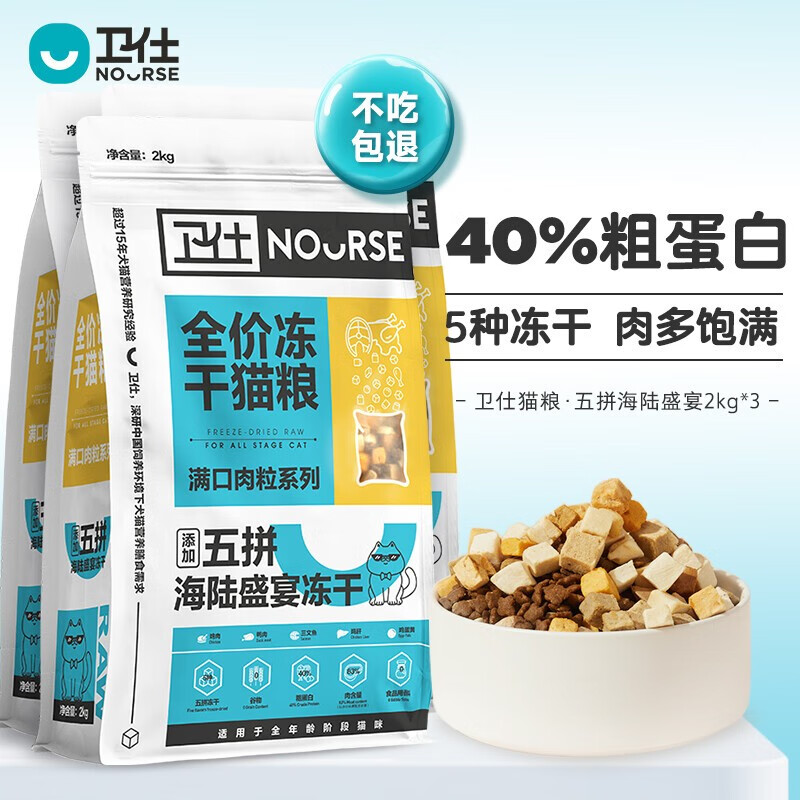 卫仕冻干五拼猫粮2kg 成猫幼猫主食卫士全价猫粮三文鱼鸡肉营养 五拼海陆盛宴猫粮2KG*3袋装