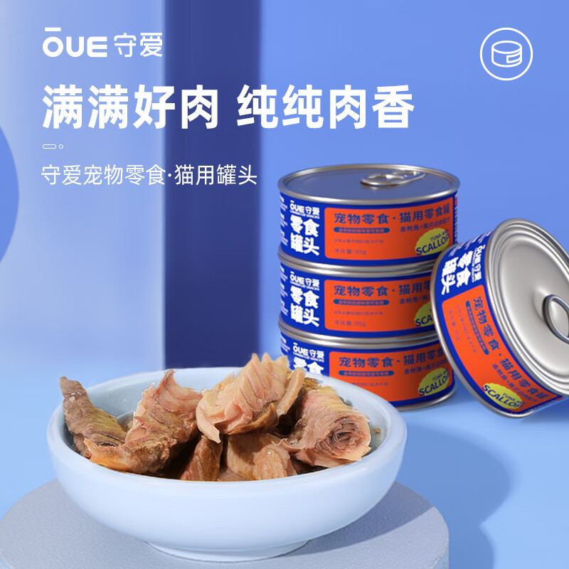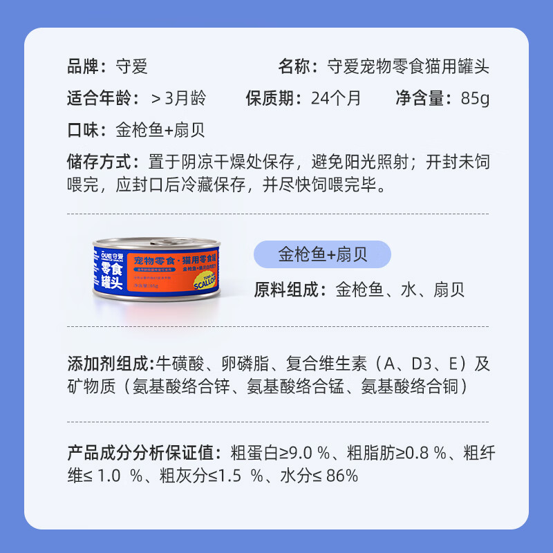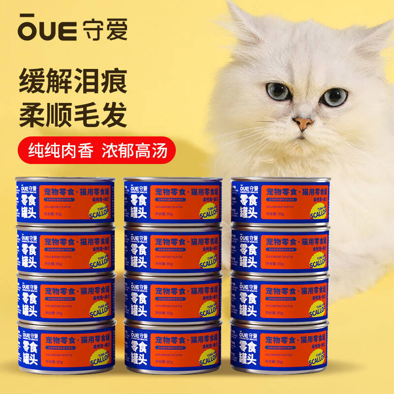 守爱纯臻浓汤经典大块肉白肉款金枪鱼扇贝猫零食 宠物猫粮湿粮罐头85g*12罐/箱