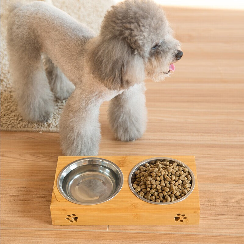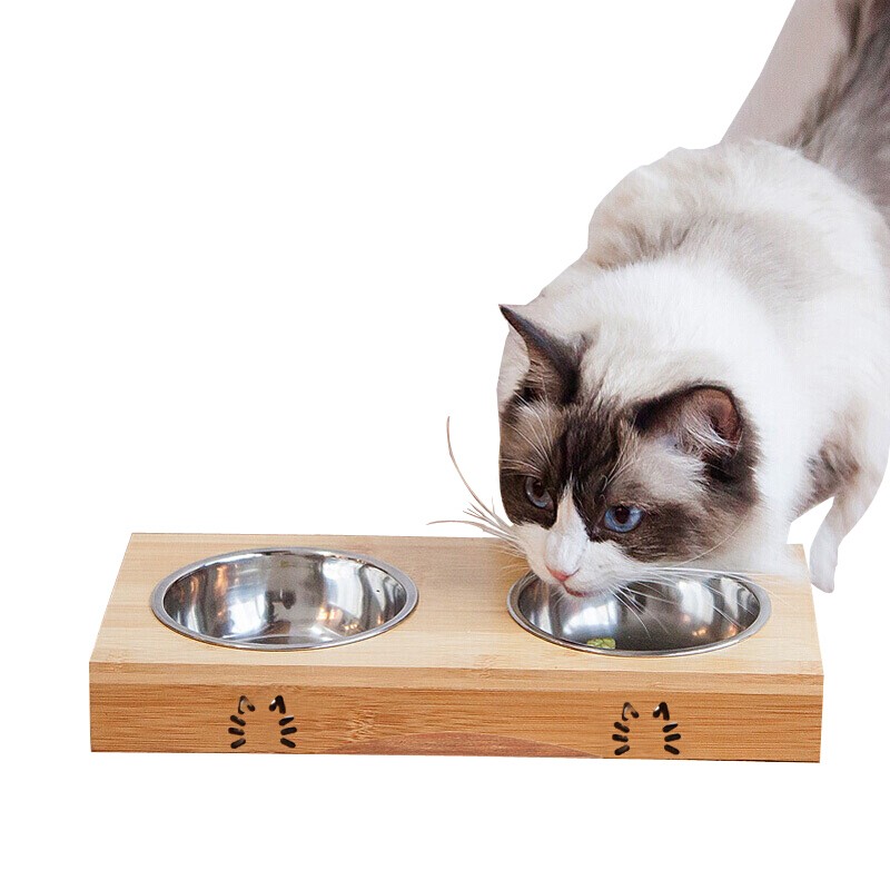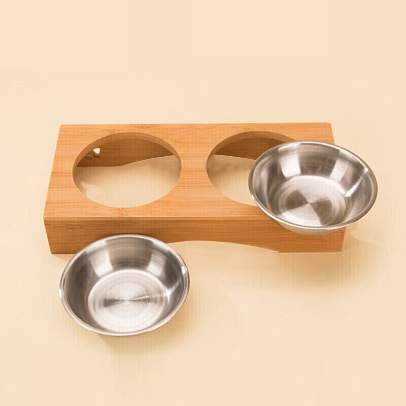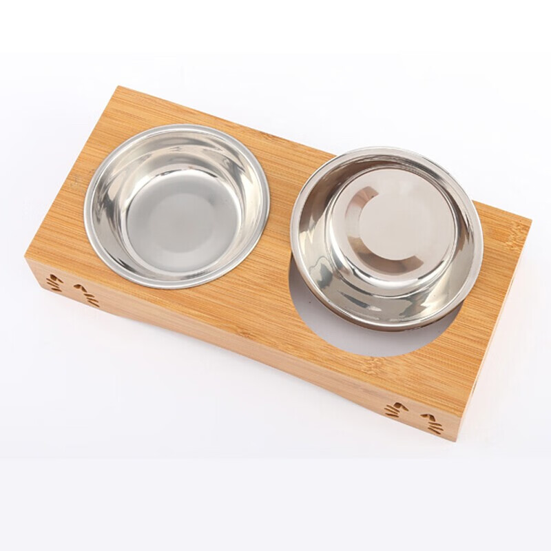 茨格曼 猫碗狗盆猫食盆宠物食盆狗狗自动饮水喂食双碗喝水器 15度倾斜猫盆 竹木双碗【尺寸29*14*5cm】容量约250毫升 *