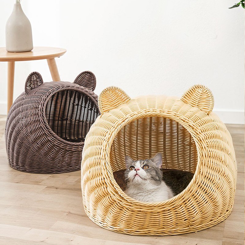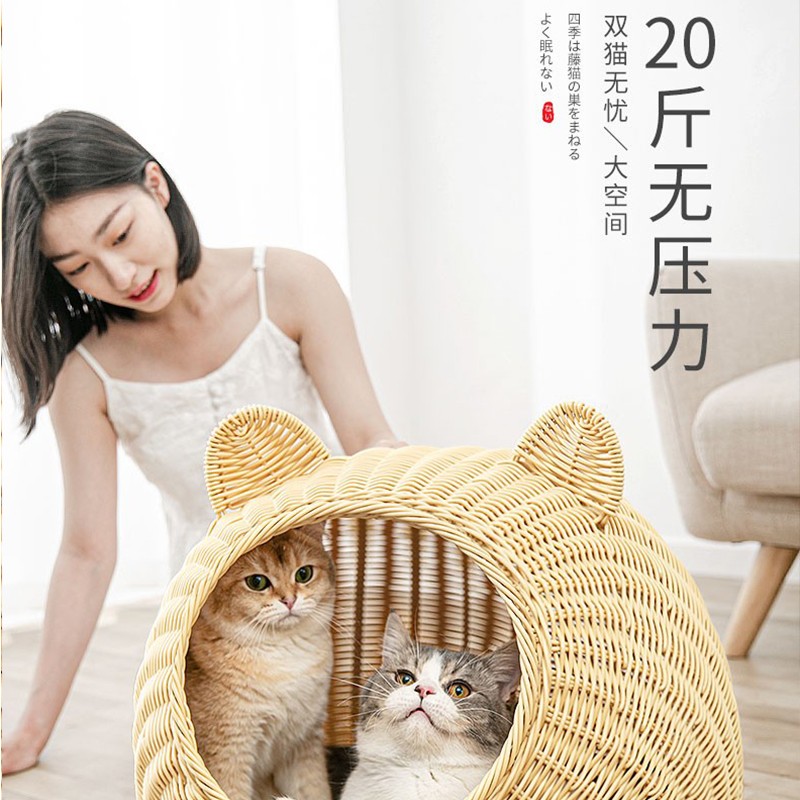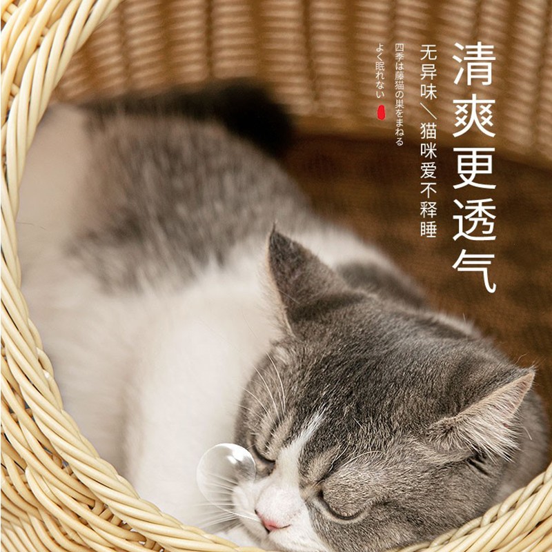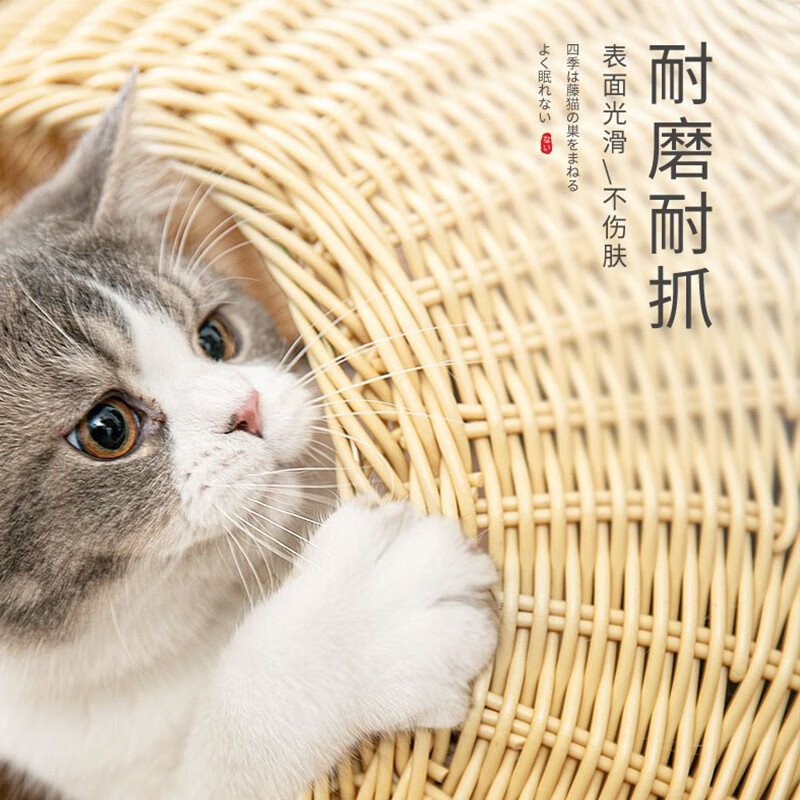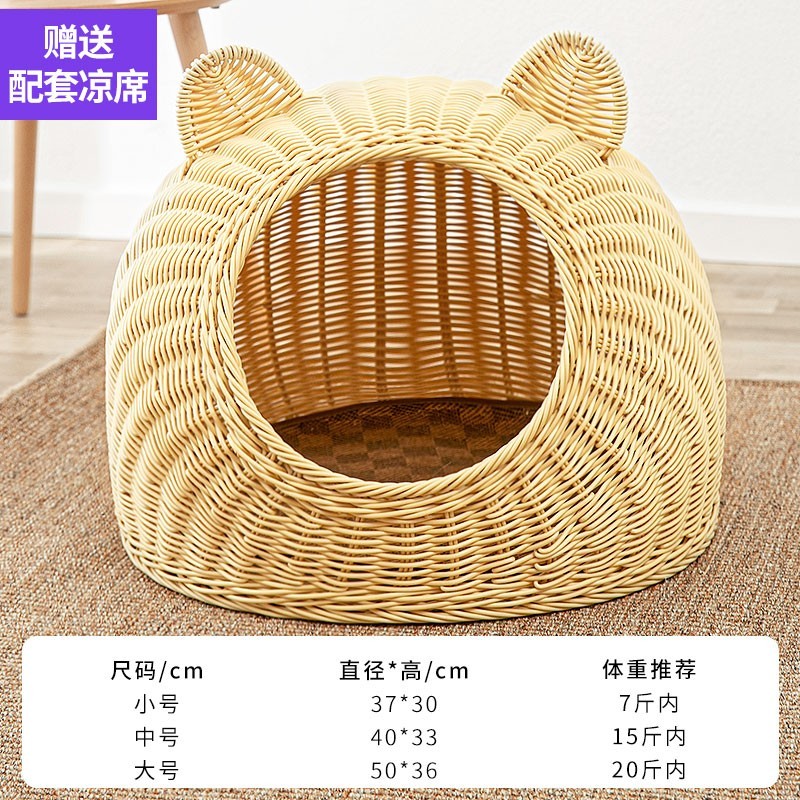 神经猫藤编猫窝四季通用夏季凉窝半封闭式房子窝可水洗狗窝狗床宠物用品 米色藤编窝【送配套凉席】 S码【直径37cm】7斤内宠物