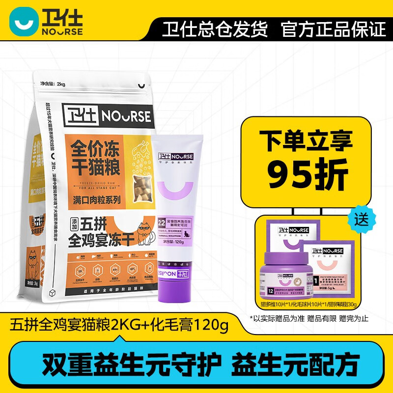 卫仕冻干五拼猫粮2kg 成猫幼猫主食卫士全价猫粮三文鱼鸡肉营养 五拼全鸡盛宴猫粮2KG 化毛膏120G