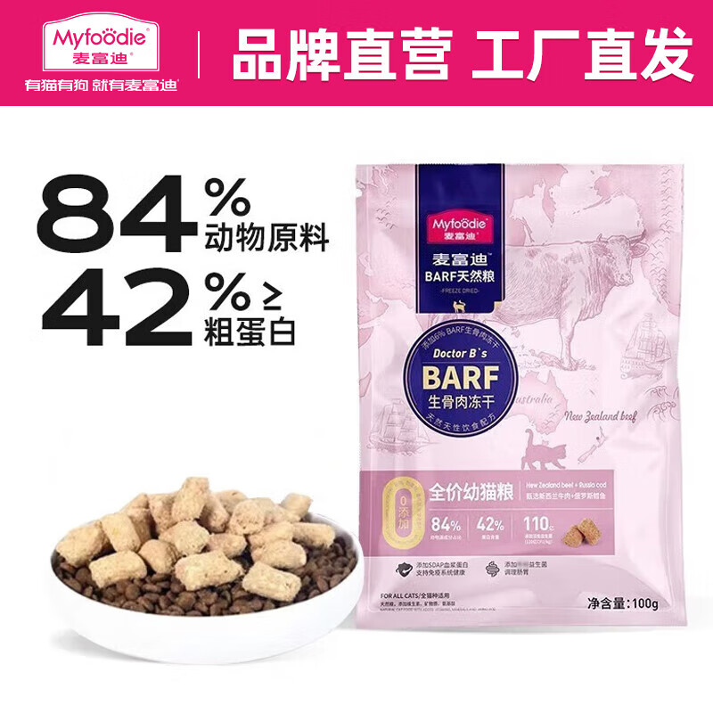 麦富迪 猫粮 barf生骨肉主食冻干双拼天然粮鲜肉营养无谷高肉高蛋白 幼猫粮试吃包100g|牛肉 鳕鱼