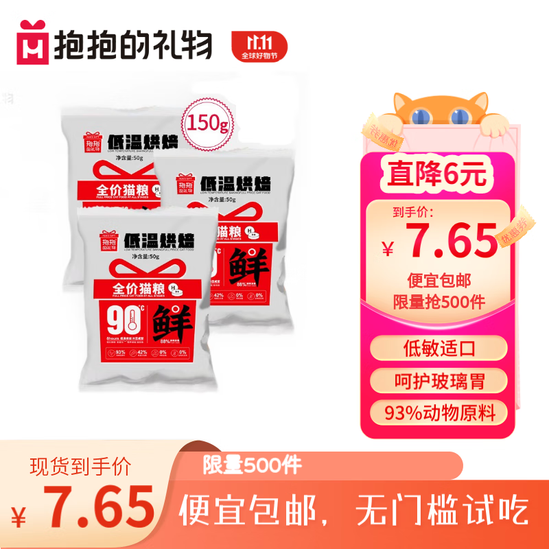 抱抱的礼物88%高鲜肉低温烘焙猫粮 天然无谷真鲜肉高蛋白成猫幼猫全价猫粮 鸡肉味|尝鲜装150g