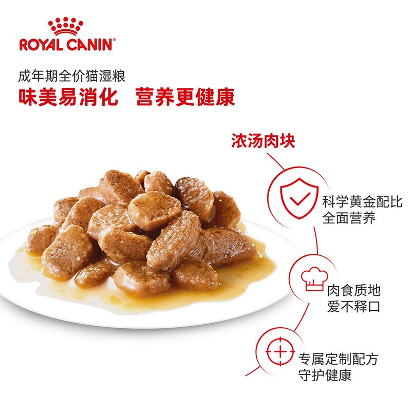 皇家猫湿粮 奥地利原装进口软包猫罐头IGP 宠物猫咪通用粮 营养易消化 成年期湿粮浓汤肉块85g 12包【整盒】