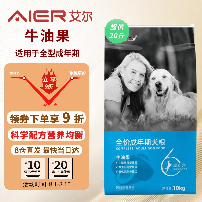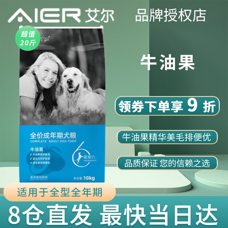 艾尔(Aier)狗粮星期六牛油果全价美毛泰迪比熊拉布拉多金毛边牧通用犬粮 星期六成犬粮10kg 20斤
