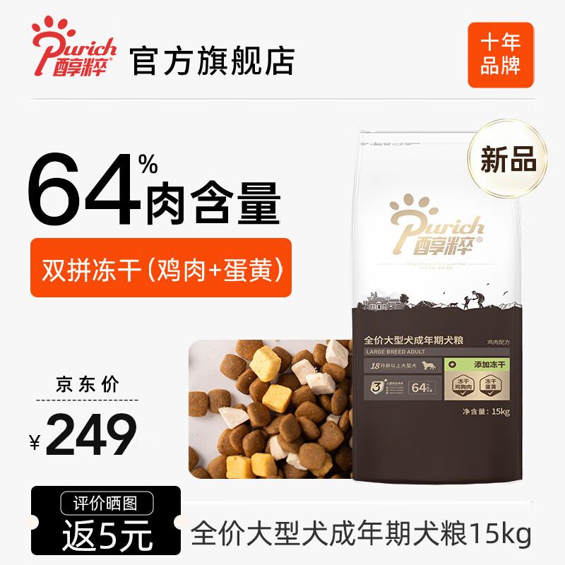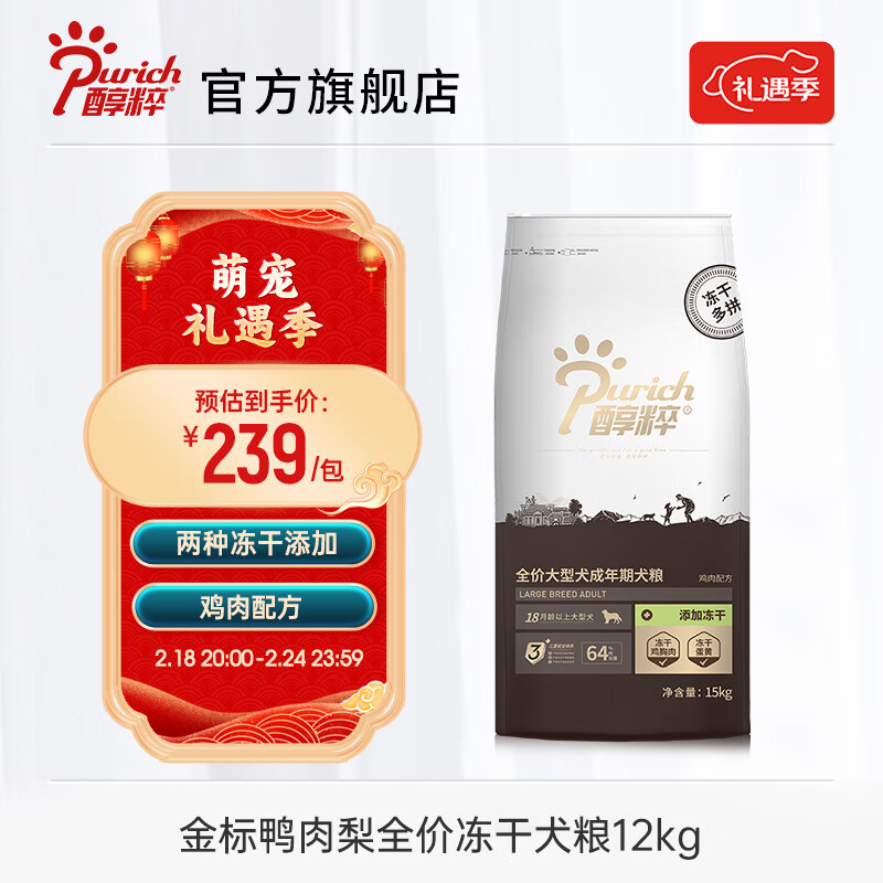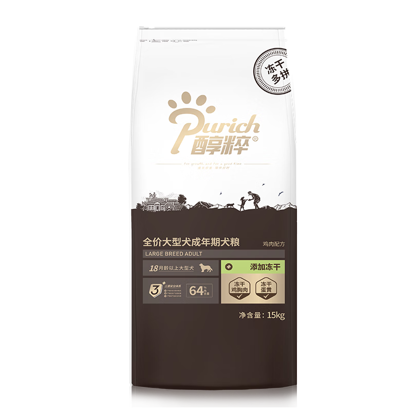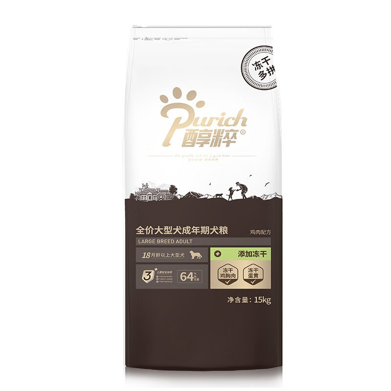 醇粹金标狗粮 全价大型犬狗干粮纯粹狗粮金毛犬粮 大型成犬15kg冻干双拼