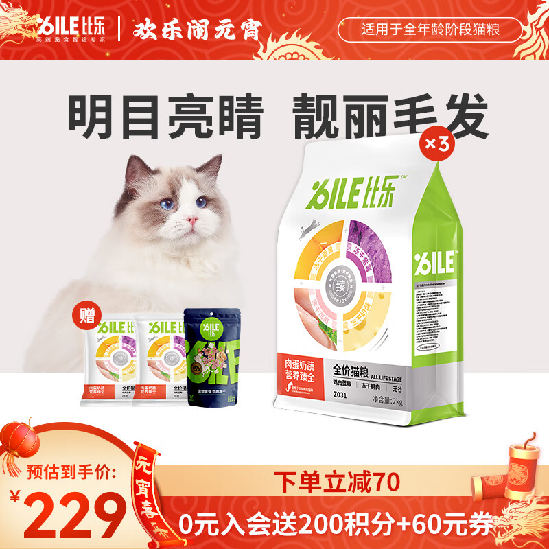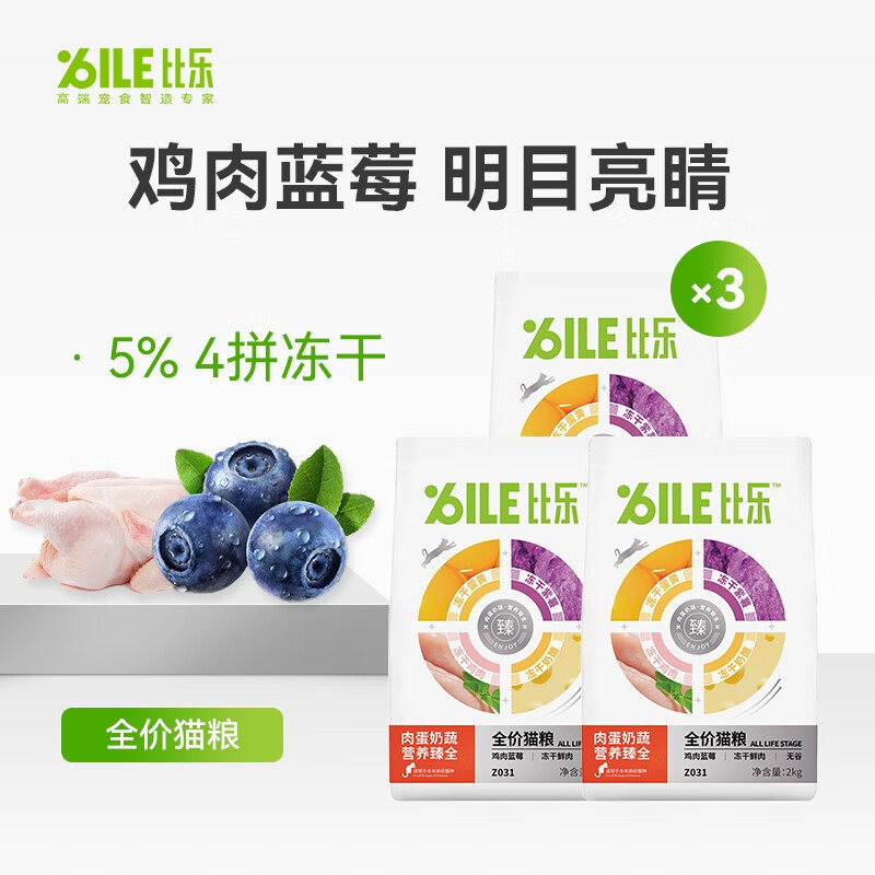 比乐臻系列全价猫粮 肉蛋奶蔬低敏无谷配方成猫幼猫全期猫粮 鸡肉蓝莓全价猫粮2kg*3
