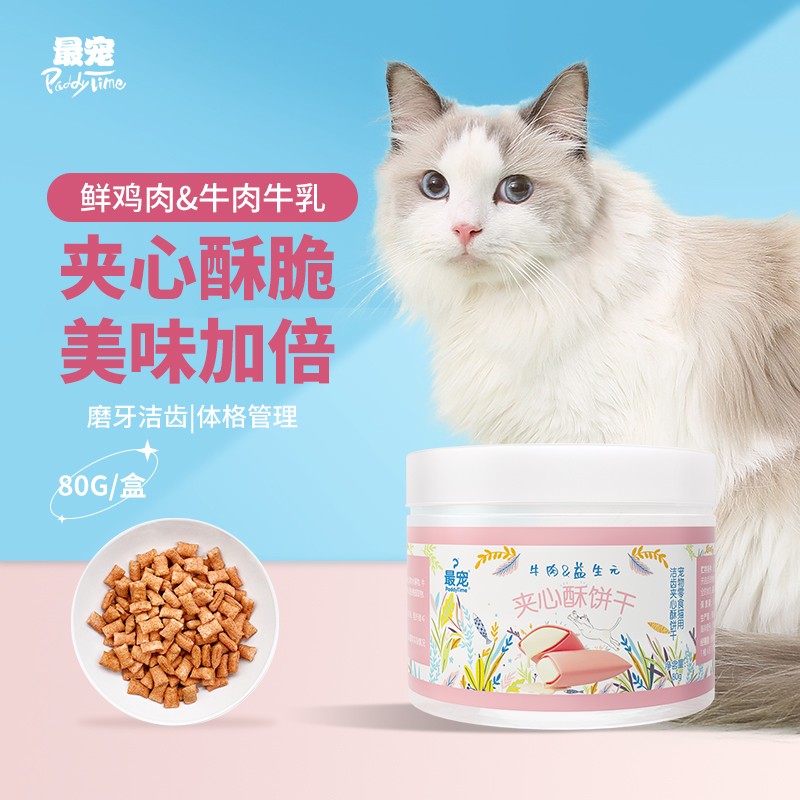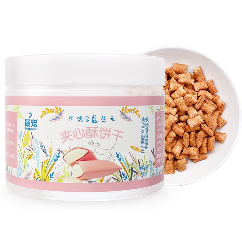 最宠(paddytime)猫零食 夹心酥脆猫饼干80g/罐 猫咪洁齿牛肉益生菌牛乳宠物食品成幼老猫通用