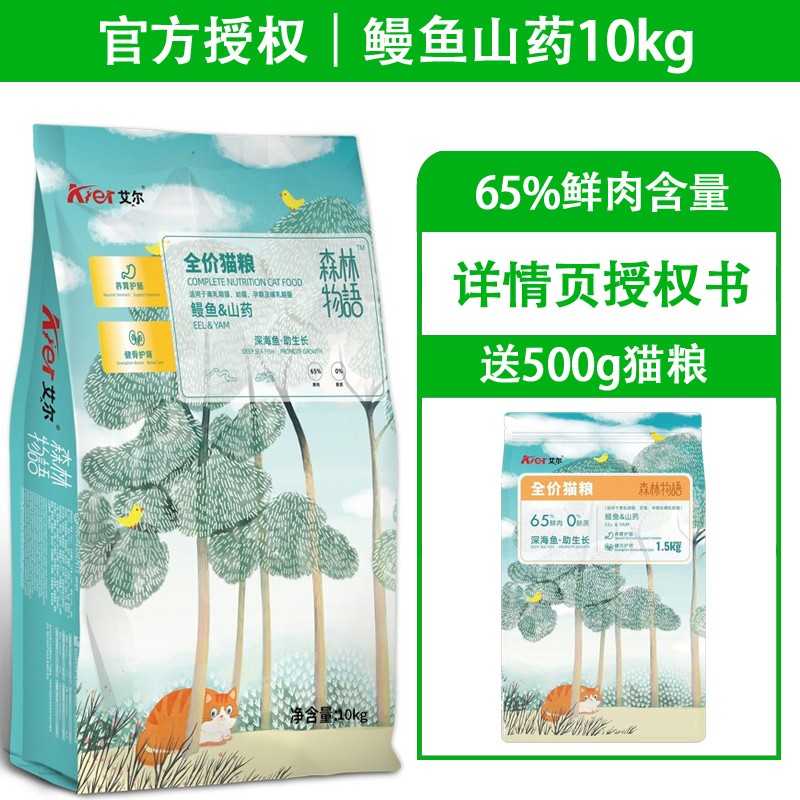 艾尔(Aier)猫粮森林物语猫粮无谷鲜肉全价低盐低油离乳期猫奶糕增肥发腮美毛 鳗鱼山药幼猫粮 10kg