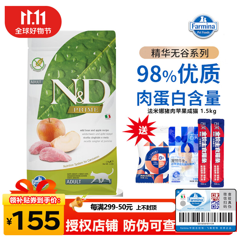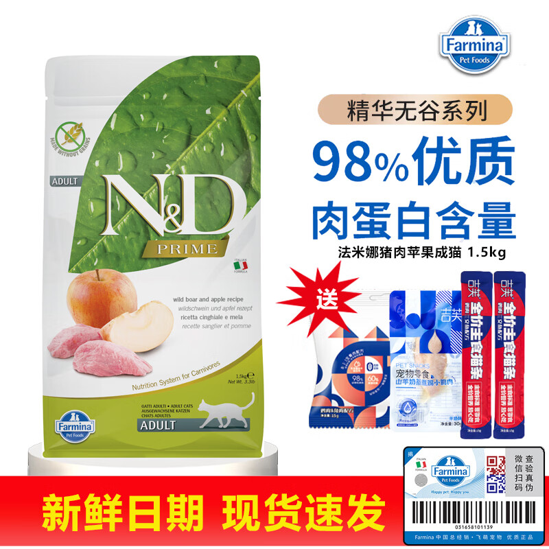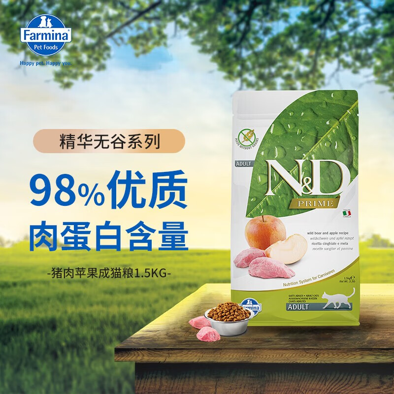 法米娜farmina猫粮鸡鱼猪肉无谷猫主粮意大利进口成幼猫猫粮营养猫食品 精华无谷-猪肉苹果成猫粮1.5kg