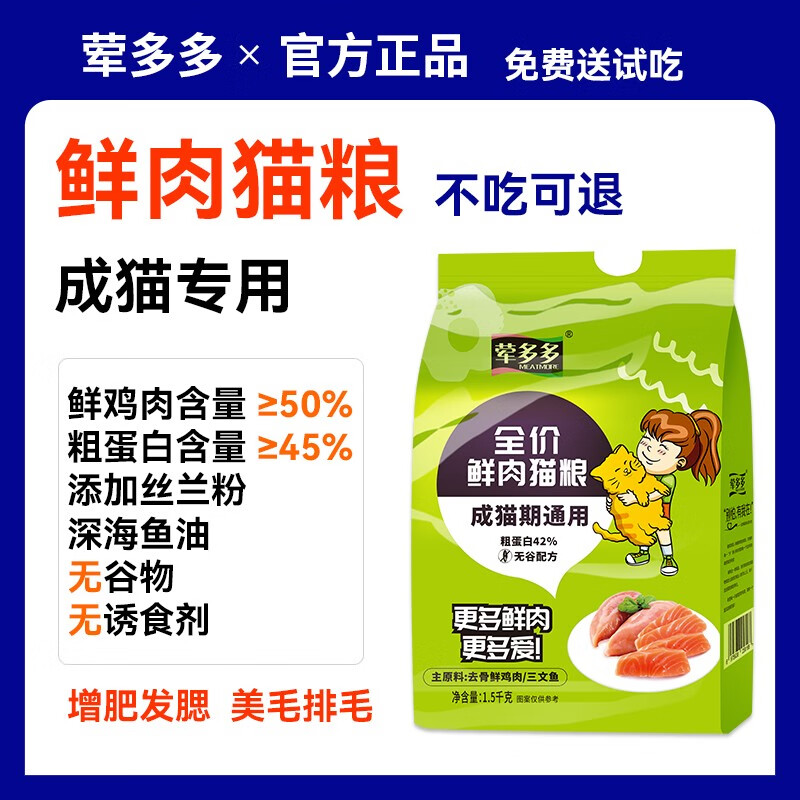 荤多多 MEATMORE猫粮通用型鲜肉鱼肉幼猫成猫蓝猫英短布偶增肥无谷生骨肉主食冻干 成猫专用【美毛排毛】 1袋【约50%去骨鲜鸡肉】