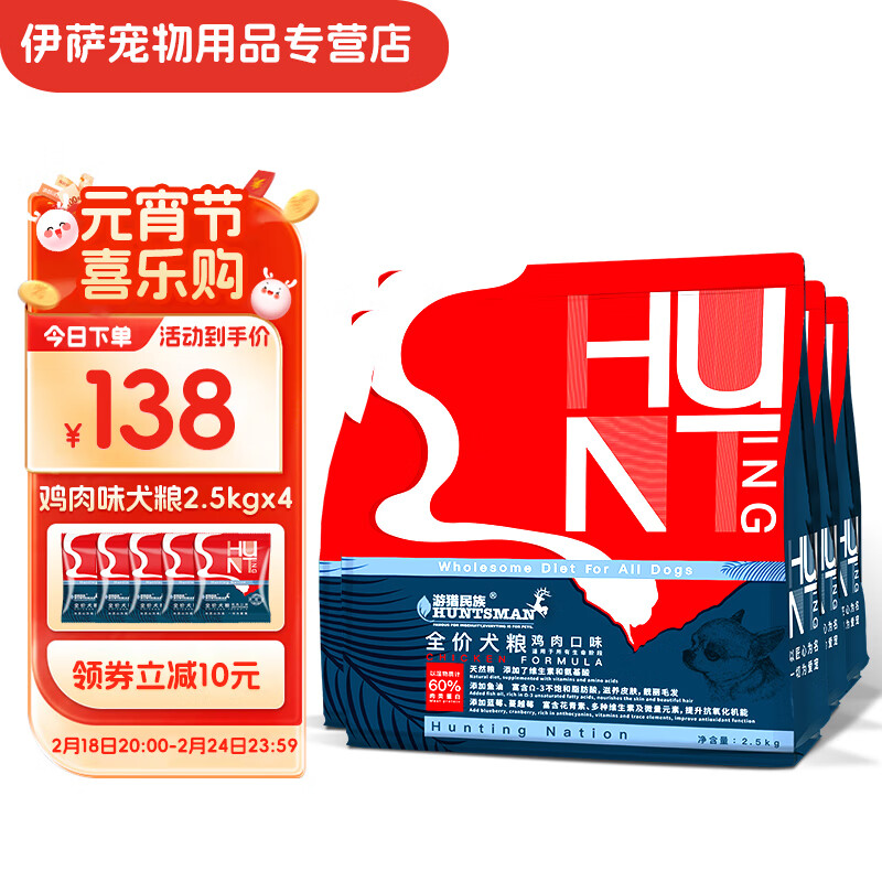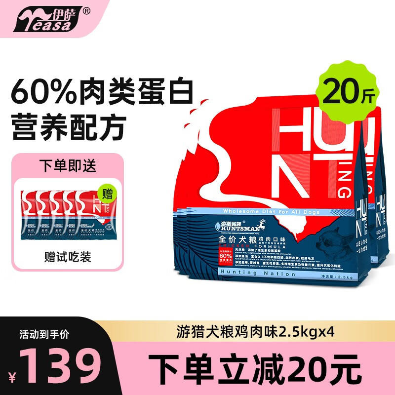 游猎民族【不吃包退】全价狗粮成幼犬通用型泰迪比熊博美狗粮柯基金毛 鸡肉味20斤(2.5kg*4袋)