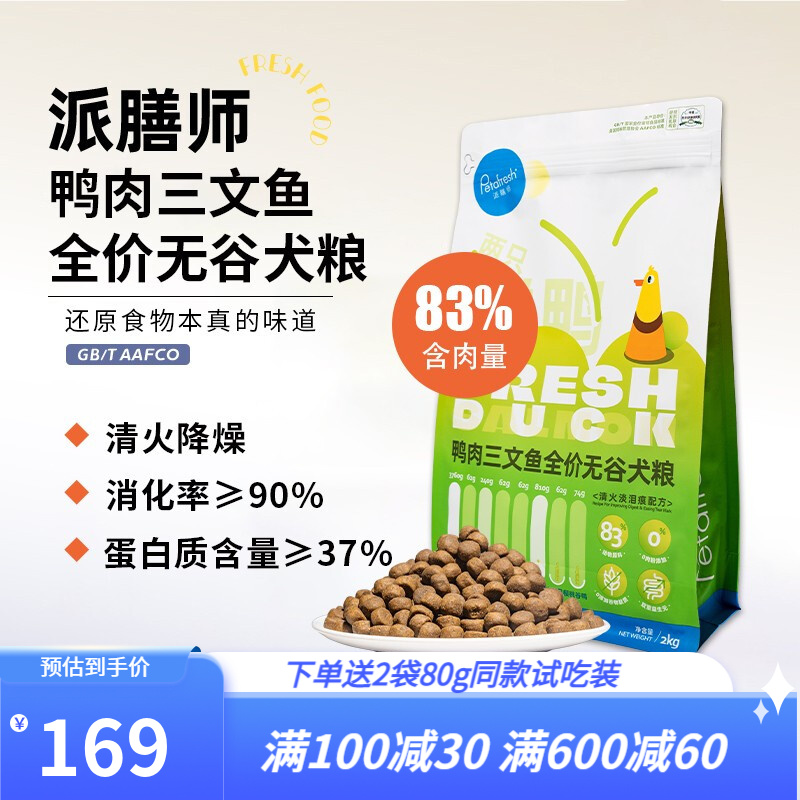 petafresh派膳师狗粮全价无谷幼犬成犬老年犬三文鱼鸭肉梨鸡肉泰迪柯基比熊金毛宠物犬粮高消化率 鸭肉三文鱼 2kg(淡泪痕)