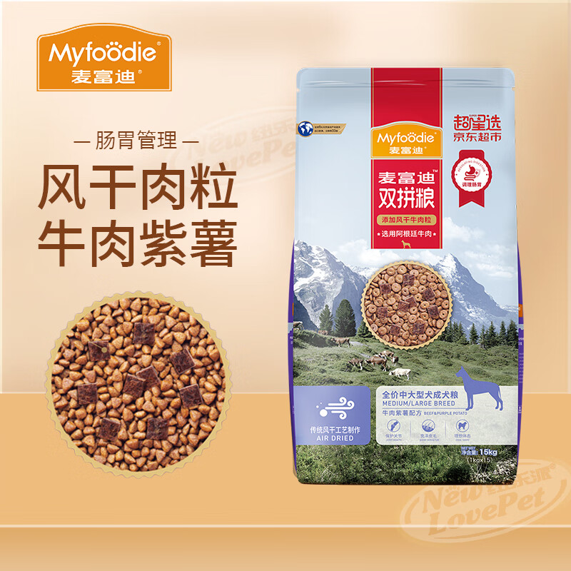 麦富迪狗粮风干牛肉双拼宠物成犬主粮 中大型成犬15kg(调理肠胃)