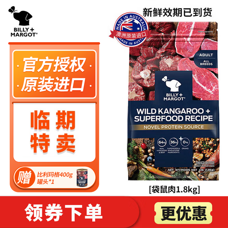 比利玛格(BILLY MARGOT)宠物狗粮澳洲进口全价犬粮无谷低敏通用金毛泰迪狗狗主粮 袋鼠肉1.8kg