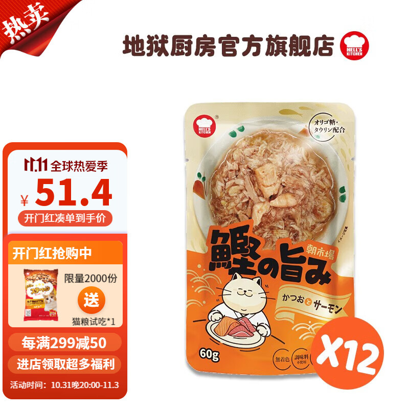 【双十一现货抢购】日本地狱厨房Hell's Kitchen进口朝市场餐包湿粮肉粒妙鲜包猫罐头成猫幼猫 鲣鱼鲑鱼*12包