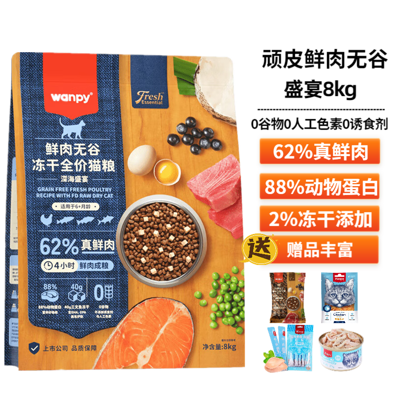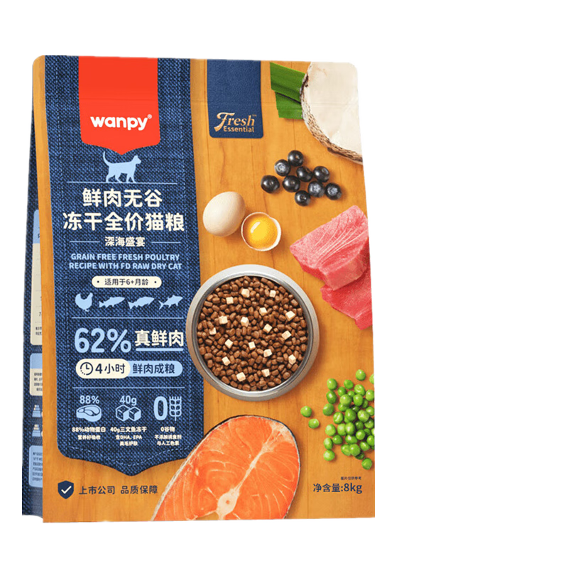 顽皮(Wanpy)猫粮鲜选62%真鲜肉无谷冻干高蛋白全价猫主粮成猫幼猫粮 深海盛宴8kg【三文鱼 金枪鱼】