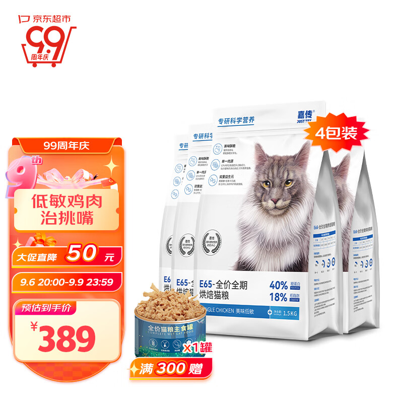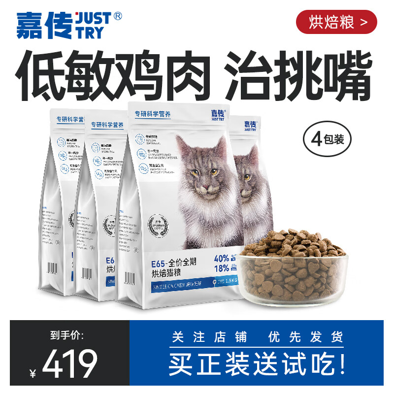 嘉传E65烘焙全价无谷全阶段成猫幼猫单一鸡肉挑嘴克星高蛋白低敏猫粮 6kg 4包装 4包试吃【囤货优选】