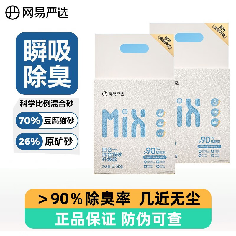 网易严选猫砂 4合1豆腐膨润土混合猫沙三重除臭高效结团几近无尘 mix混合猫砂2.5kg*2包
