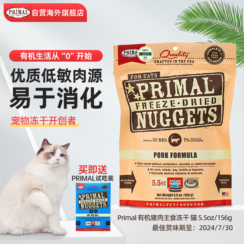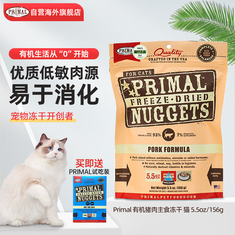PRIMAL猫冻干主食猫咪生骨肉成幼猫pr冻干猫粮有机猪肉味156g