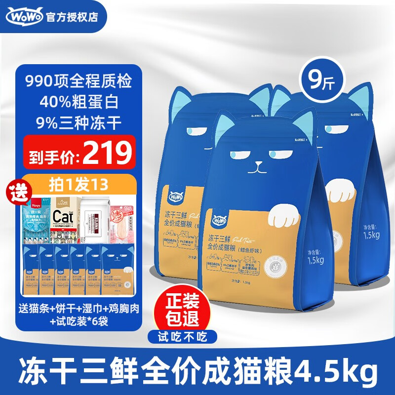 喔喔(WOWO)猫粮成猫老年猫鳕鱼虾冻干三鲜全阶段全价猫干粮英短美短布偶通用 【囤货款】4.5kg/9斤