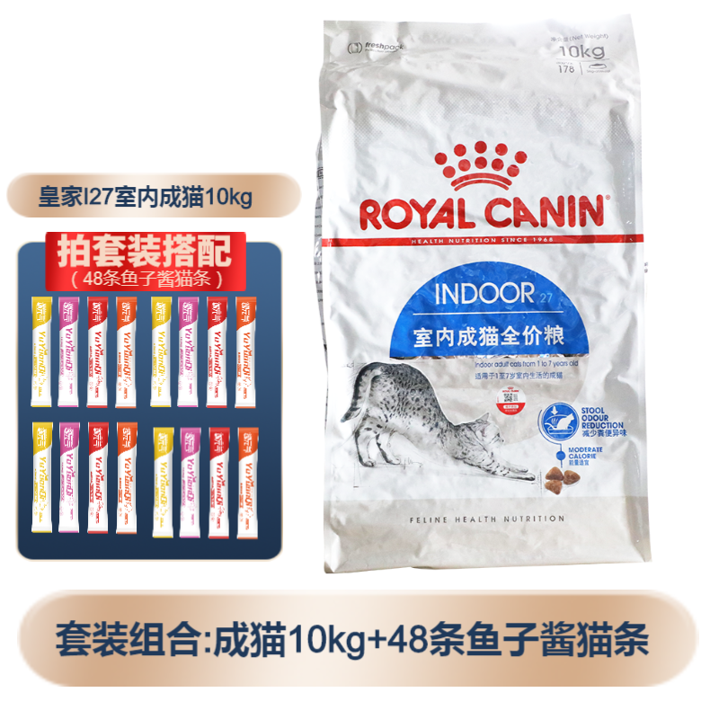 ROYAL CANIN 皇家猫粮I27室内成猫粮去毛球 室内成猫10kg 鱼子酱猫条48条