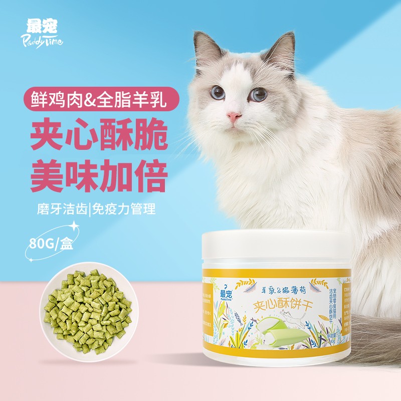 最宠(paddytime)猫零食 夹心酥脆猫饼干80g 猫咪洁齿鸡肉羊乳猫薄荷宠物食品小鱼成幼老年猫粮毛球挑嘴