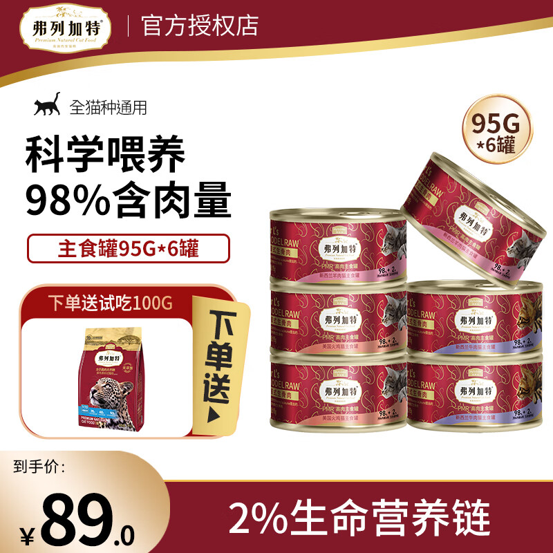 弗列加特猫罐头 生骨肉主食罐98%高含肉量成猫幼猫通用型猫湿粮 混合口味95g*6罐
