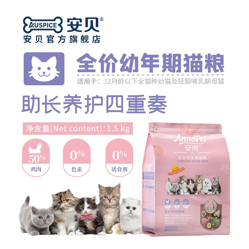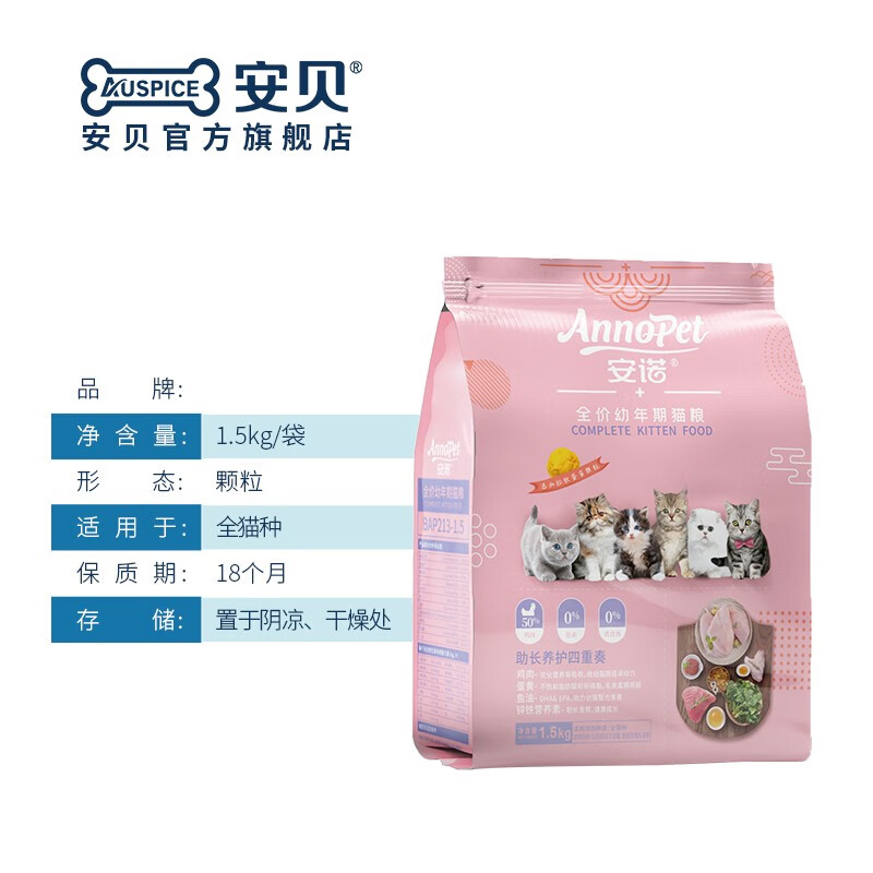 安贝安诺新品幼猫粮 50%鸡肉幼猫助长养护美毛鱼油补钙 全价猫粮 鸡肉蛋黄(1.5kg) 1.5kg 幼猫