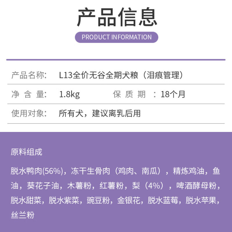 拉小妃(DLafettee)无谷冻干生骨肉狗粮L13全价无全期犬粮泰迪博美调理泪痕主粮 L13(泪痕管理)犬粮 1.8kg