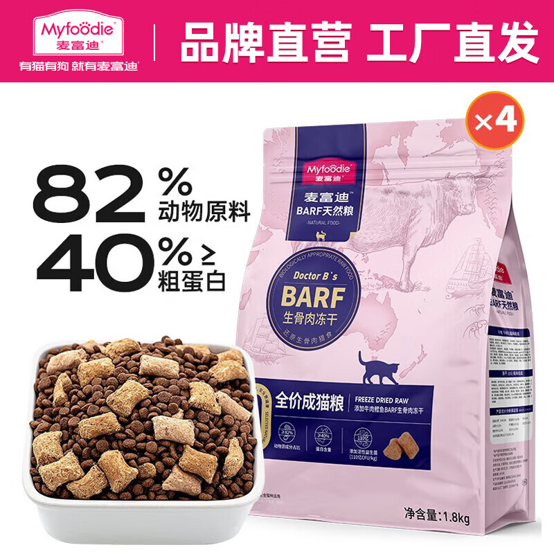 麦富迪 猫粮 barf生骨肉主食冻干双拼天然粮鲜肉营养无谷高肉高蛋白 成猫7.2kg|牛肉鳕鱼