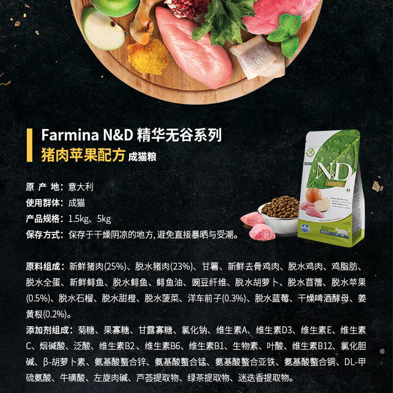 法米娜(Farmina)无谷猫粮 意大利原装进口幼成猫主粮 成猫粮|猪肉苹果5kg