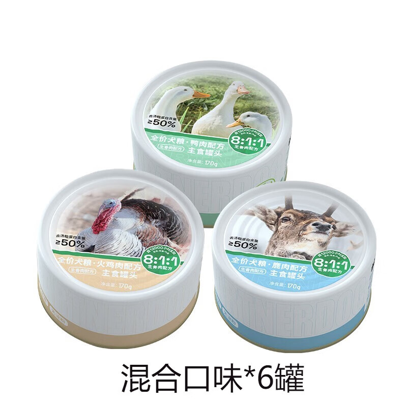 帕特全价生骨肉主食罐全价无谷全犬种通用鹿肉火鸡鸭肉狗湿粮主食罐头 混合口味*6罐