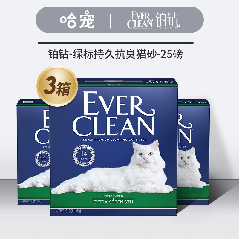 铂钻(EverClean)猫砂美国原装进口【3盒】25磅膨润土 猫咪无尘猫沙除臭 绿标-25磅*3盒