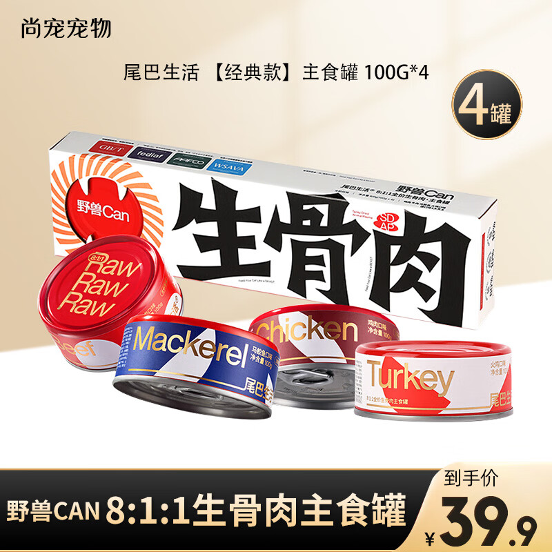 尾巴生活猫罐头 野兽CAN 811生骨肉主食猫罐头170g 猫咪幼猫成猫罐头湿粮 【经典款】100g*4罐