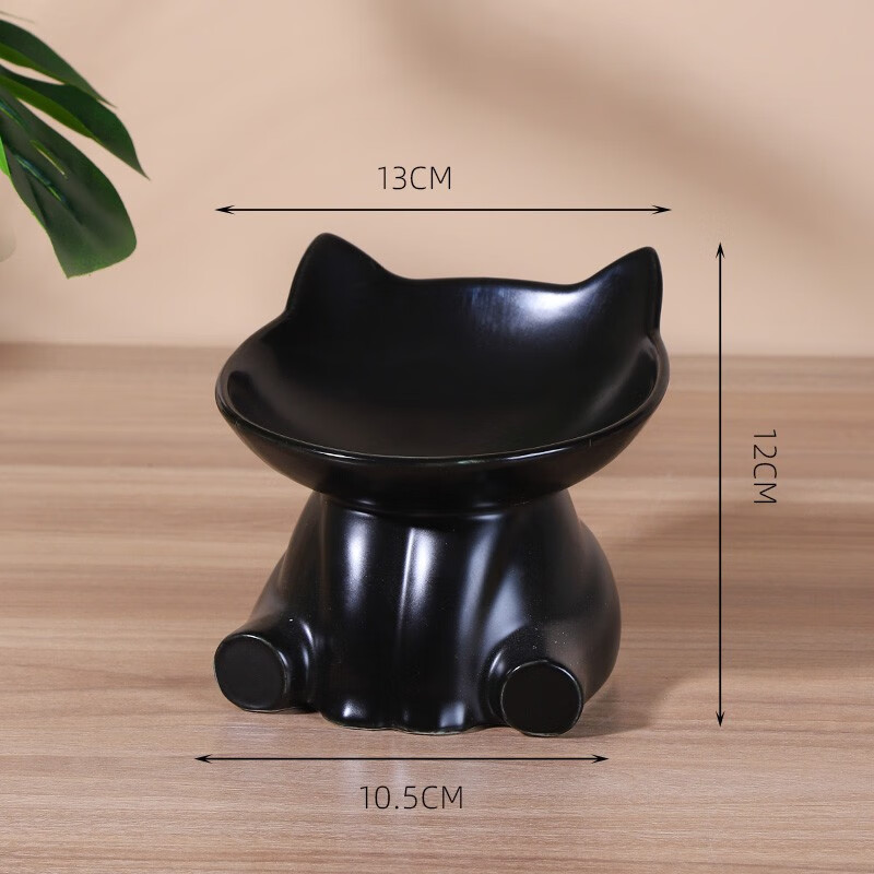 烁坭高脚猫碗陶瓷防打翻饭斜口碗猫咪食盆喝水保护颈椎饮水宠物狗粮碗 坐立黑色尖耳碗