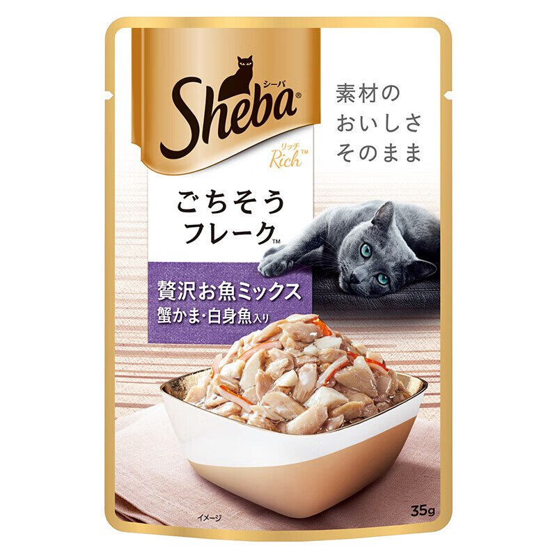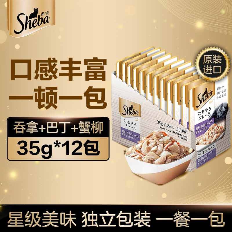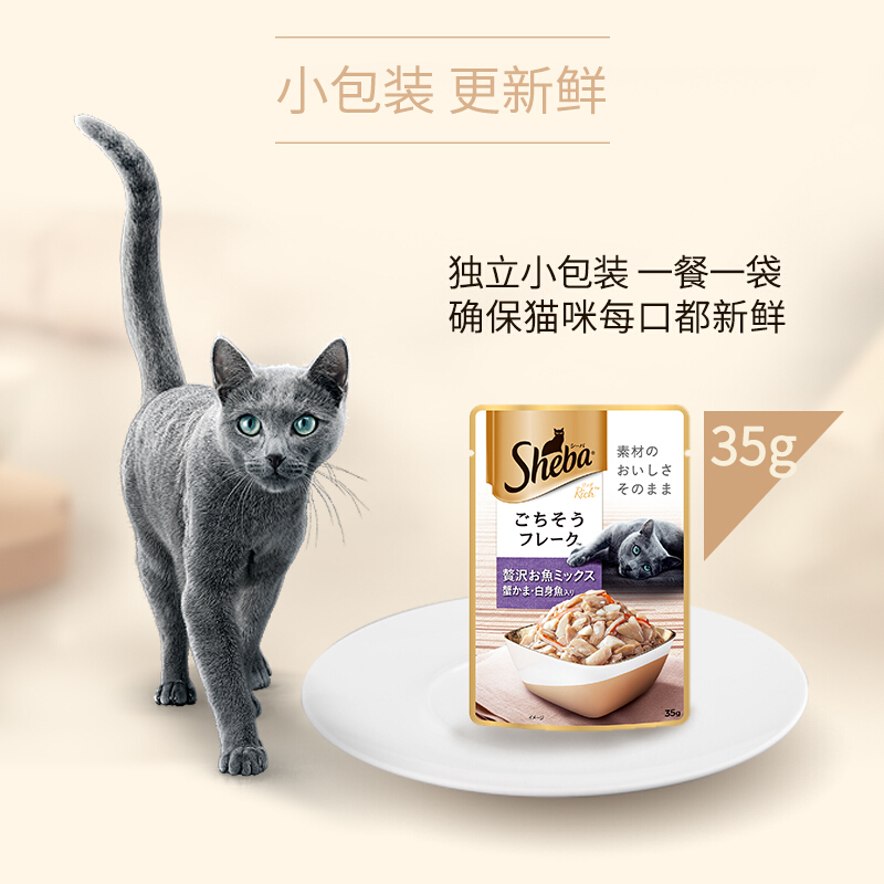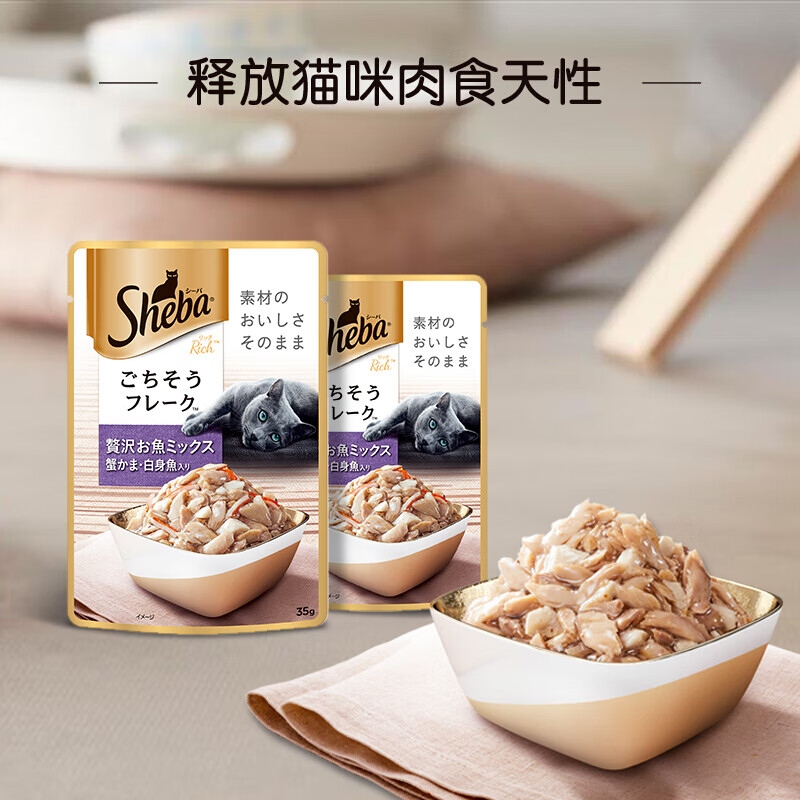 希宝(Sheba)猫零食成猫湿粮罐头 甄选肉块妙鲜包 吞拿鱼巴丁鱼蟹柳35g*12整盒装
