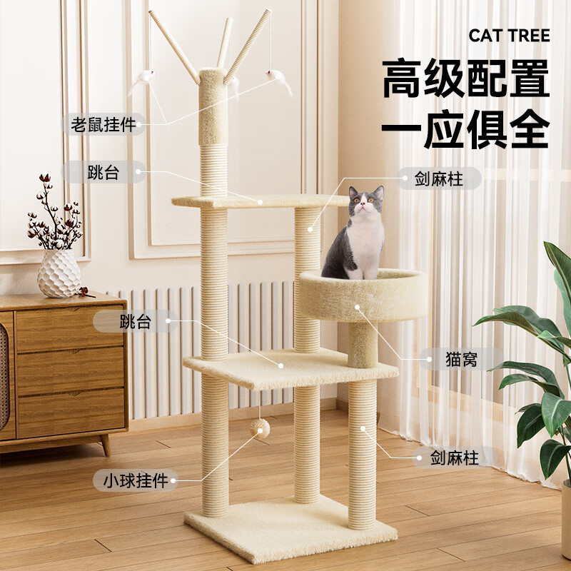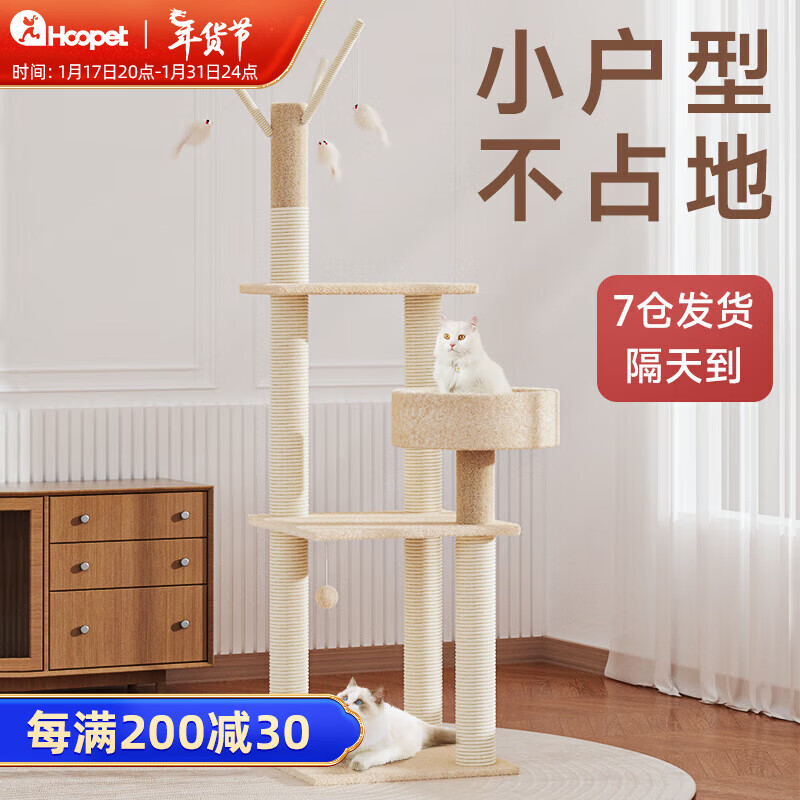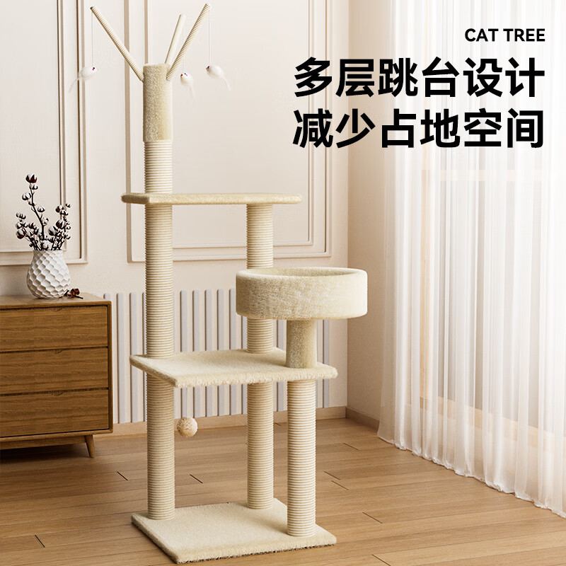 hoopet猫爬架猫窝猫树一体中型小户型剑麻麻绳猫抓柱小型猫咪跳台立式猫架子猫抓板猫玩具不占地猫爬板 【1.25米】四层树杈带窝带老鼠米色