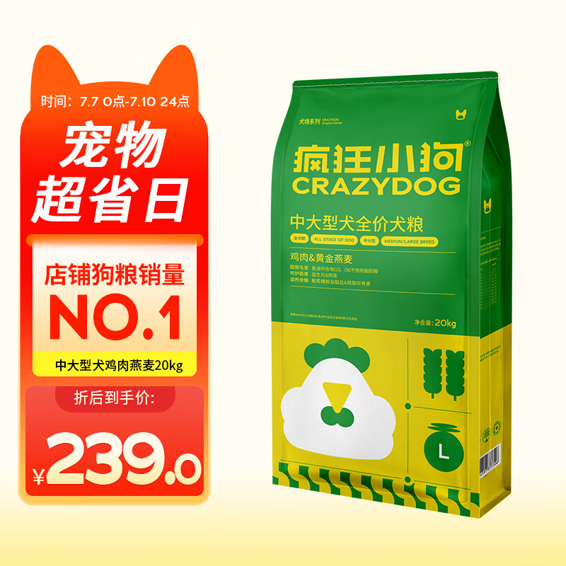 哆莫阳光(DUOMOYANGGYANG)疯狂小狗 狗粮金毛拉布拉多柴犬萨摩耶德牧10kg犬粮 宠物幼犬成犬 【】鸡肉燕麦20kg