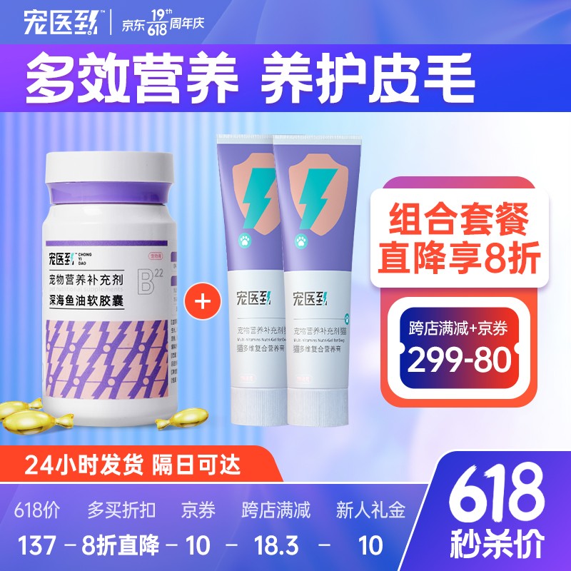 【七仓直发】宠医到 宠物鱼油99.9%纯度【含DHAΩ-3卵磷脂】狗狗猫咪美毛亮毛防掉脱毛营养品 99.9%进口鱼油60粒 猫复合营养膏2支