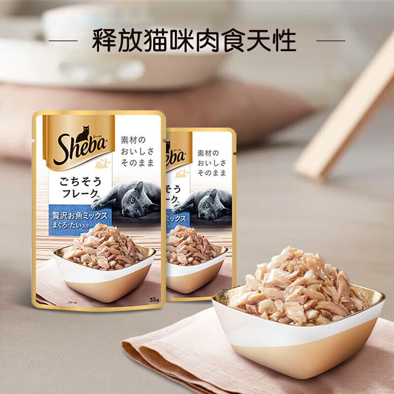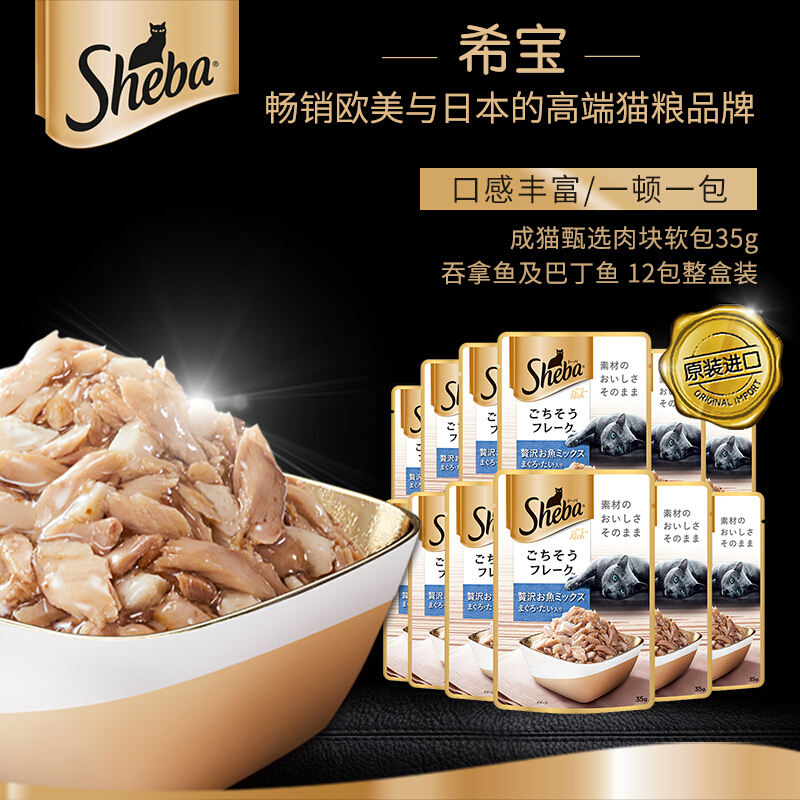 希宝(Sheba)猫零食成猫湿粮罐头 甄选肉块妙鲜包 吞拿鱼巴丁鱼35g*12整盒装