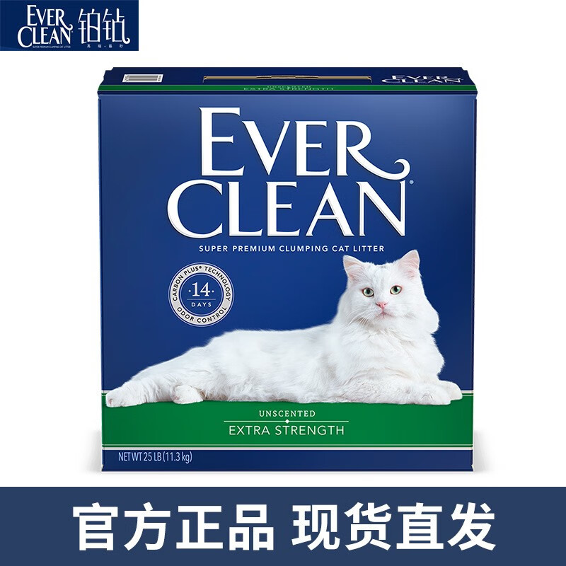 铂钻(EverClean)美国进口铂钻猫砂蓝标 活性炭除臭膨润土矿石低尘 绿标-25磅-抗臭无香