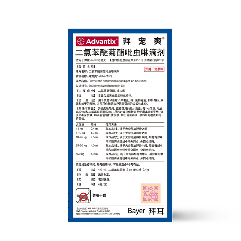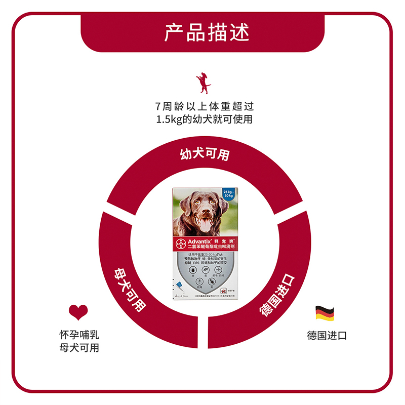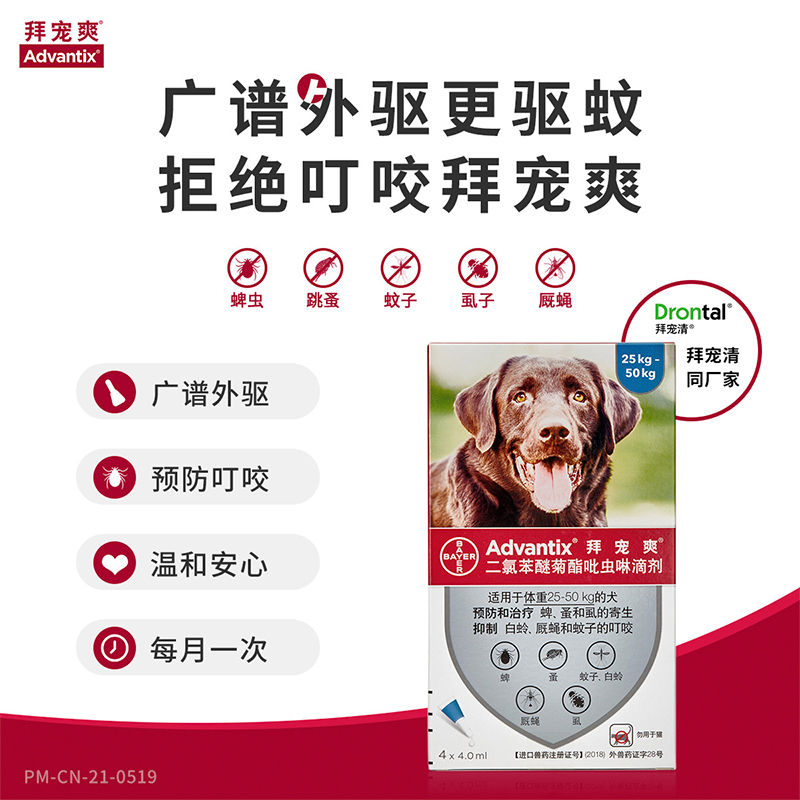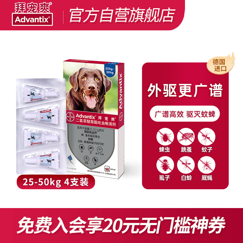 德国进口拜耳拜宠(爽Advantix)狗狗体外驱虫药滴剂 大型犬(≥25kg)驱除跳蚤蜱虫蚊子虱宠物药品4支装