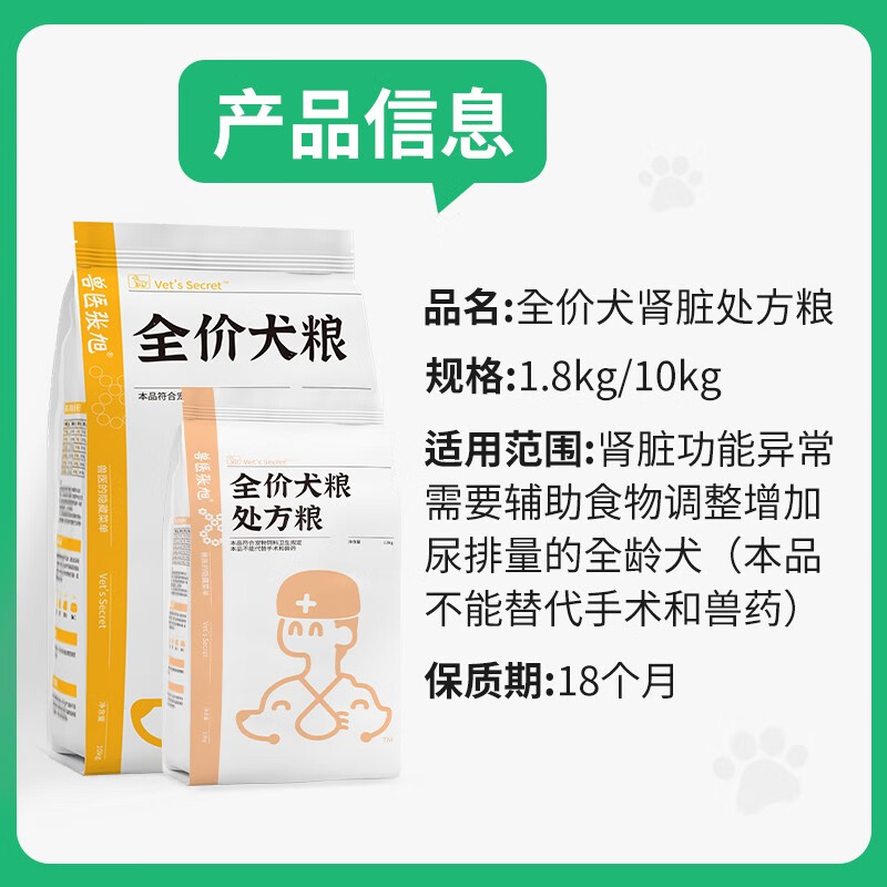 兽医张旭 狗粮肾脏处方粮 大小型犬成犬幼犬泰迪金毛拉布拉多通用型 全价配方狗粮犬粮 10kg
