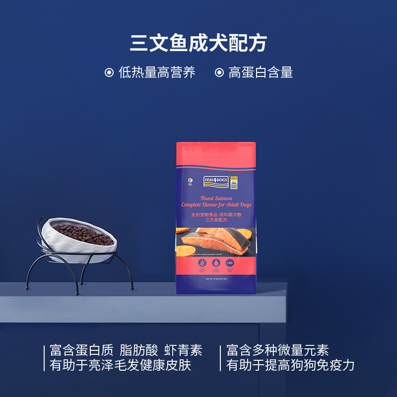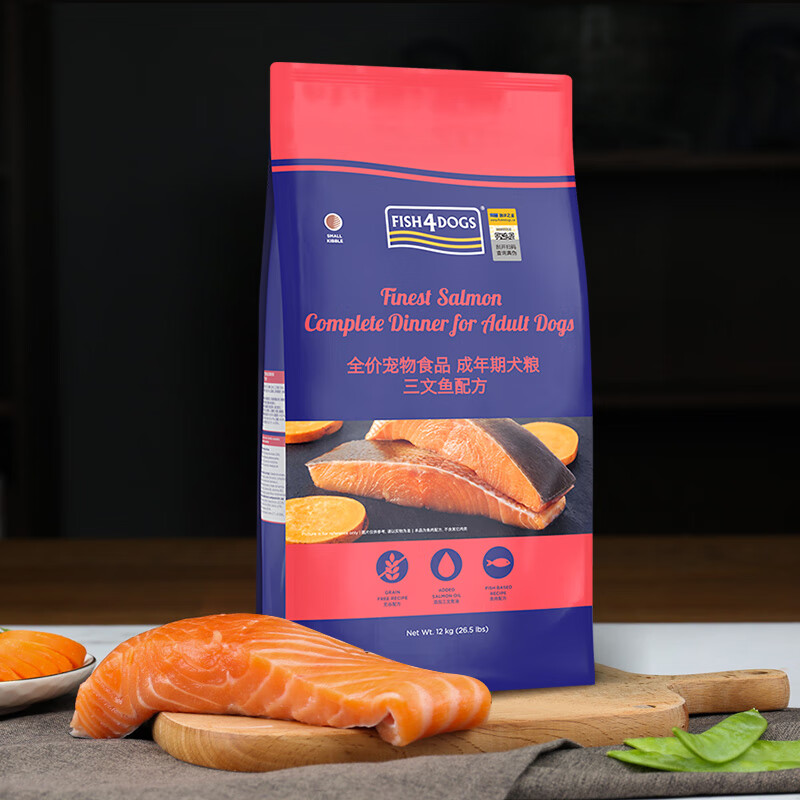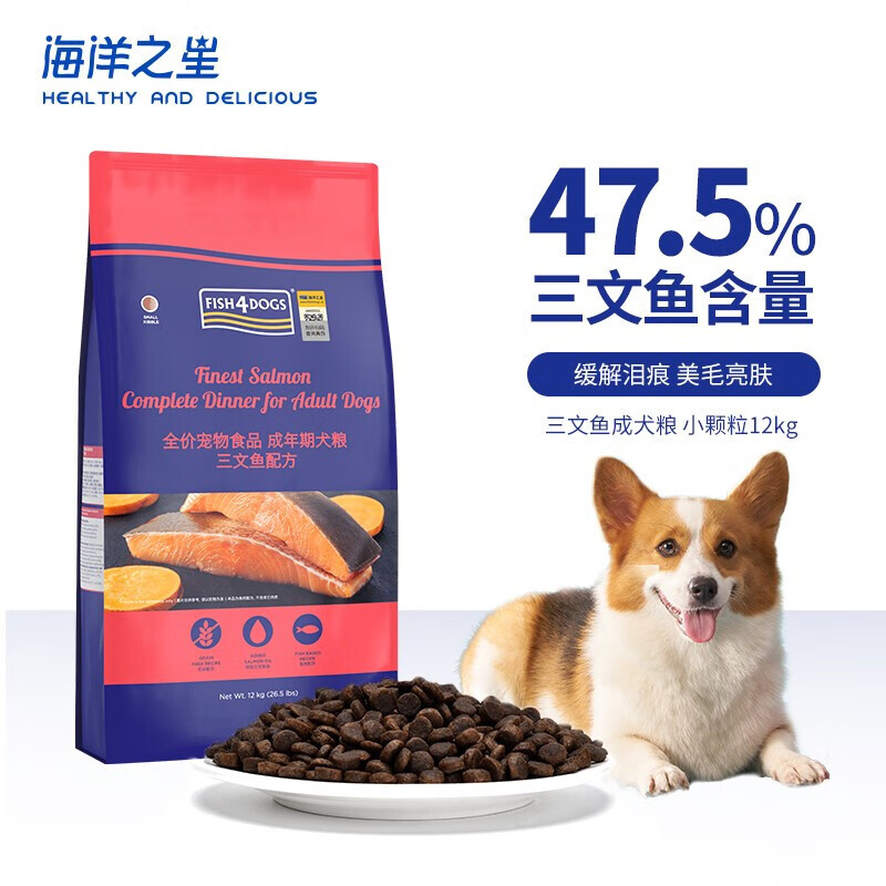 海洋之星(fish4dogs)天然无谷鱼油美毛全期犬粮泰迪比熊柯基金毛拉布拉多萨摩狗粮 三文鱼成犬粮12kg(小颗粒)