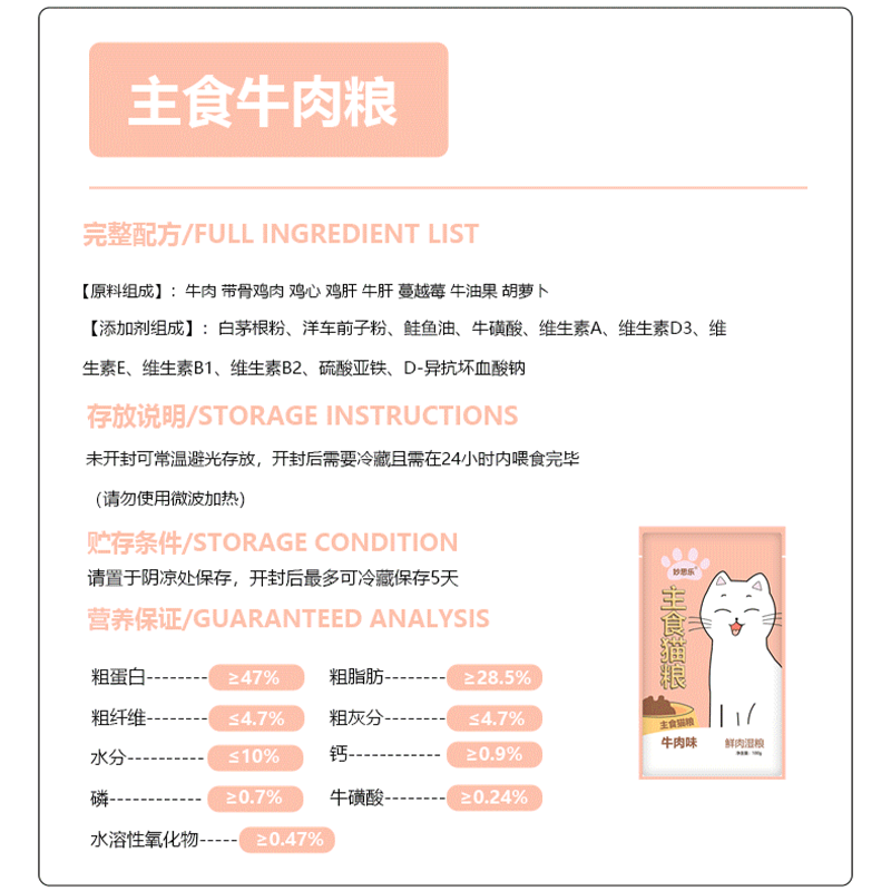 妙思乐全价主食猫粮鲜肉湿粮肉泥多种口味可搭配干粮冻干拌食100g/袋 牛肉味 9袋
